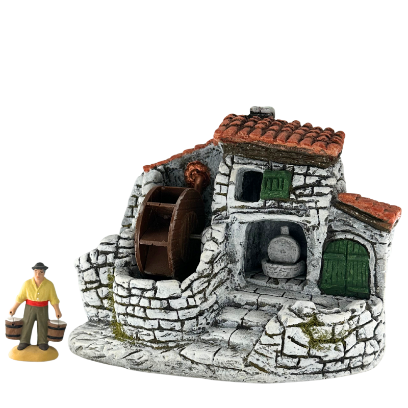 Le temps passe et fait tourner la roue de la vie comme l’eau celle des moulins a dit le poète. Quant à la roue de ce grand moulin, orné de mousse et entouré de rochers, elle peut réellement tourner dans votre crèche provençale grâce à une prise secteur. Peint à la main, nous nous sommes attachés à rendre le moindre détail pour un décor au rendu toujours plus authentique.
