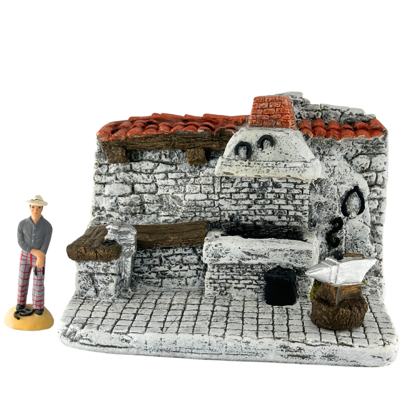 Voici la forge du village où l’artisan façonne à coups de marteau et de brasier des objets de la vie quotidienne et des fers pour les chevaux de votre crèche provençale. Pour plus de véracité le foyer peut s’éclairer une fois branché sur secteur.