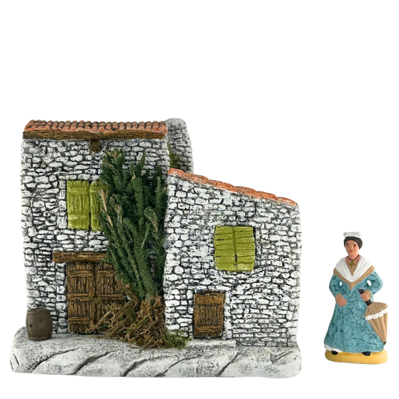 Ce décor de crèche provençale est particulièrement remarquable d’authenticité. Cette maison de village en pierre blanche est divisée en deux, scandée par des volets de bois bleu et envahie de mousse verte. Un arbuste cache partiellement une grande porte d’atelier.
