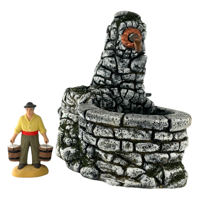 Cette fontaine d’une grande simplicité n’en est pas moins détaillée à l’extrême. Élément indispensable d’une crèche traditionnelle, elle permet d’en augmenter l’architecture subtilement tout en ajoutant un élément utile. Fabriquée artisanalement et peinte à la main, cette fontaine s’intègrera parfaitement à vos décors.