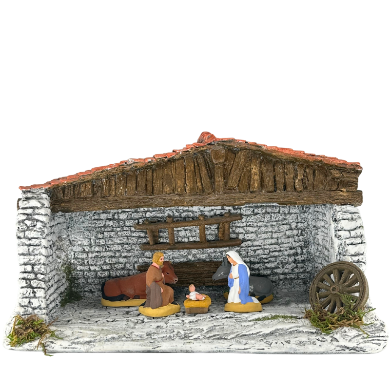Cette étable haute de 20 cm dénote par ses détails charpentés. Large de 35 cm, elle met à votre disposition un espace assez large pour rassembler le bétail de votre crèche. Une auge et un râtelier à foin ornent le mur du fond en contrats avec les pierres blanches soigneusement peintes. Un bel ornement pour vos mises en scène !