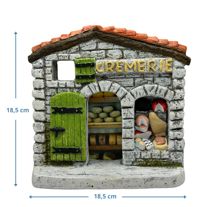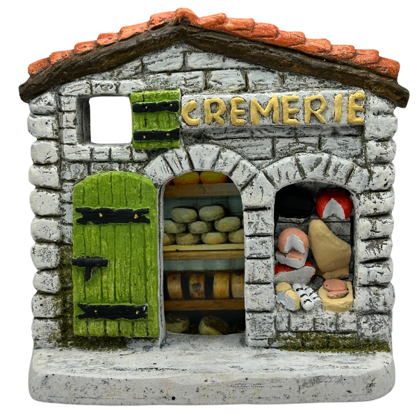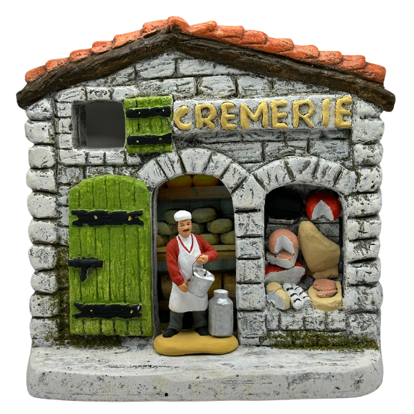 Plongez au cœur d’un village provençal avec ce décor de crèche représentant une crèmerie traditionnelle, où les fromages de toutes les formes évoquent les saveurs simples d’antan. Entre les étals bien garnis et l’ambiance chaleureuse du lieu, cette scène apporte une touche de vie et d’authenticité à votre crèche.