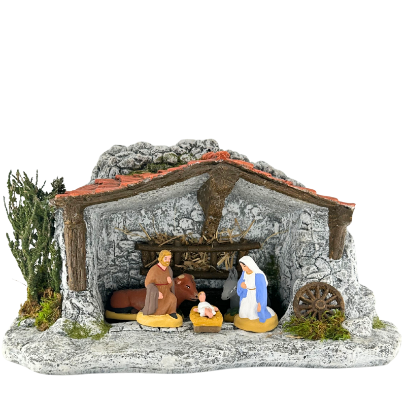 Cette grande étable de 18 cm de haut et 33 cm de large vous permettra de disposer votre bestiaire et de l’abriter sous son toit en double pente. Dans le fond, vous pourrez remplir l’auge d’un peu de paille pour plus d’authenticité. Le rouge des tuiles se détache joliment sur le blanc de la pierre brute.