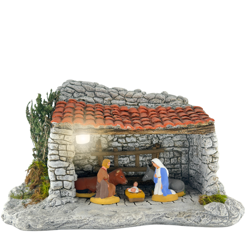 Cette belle étable de 19 cm de haut pour 32 cm de large, bordée d’arbre et de verdure, a la particularité d’être munie d’un système électrique qui, une fois branché sur secteur, vous permettra d’en éclairer l’intérieur d’une douce lueur. Dans la pénombre, votre crèche prendra l’allure d’un village typiquement provençal en train de s’affairer et de se préparer pour la nouvelle nuit qui commence.